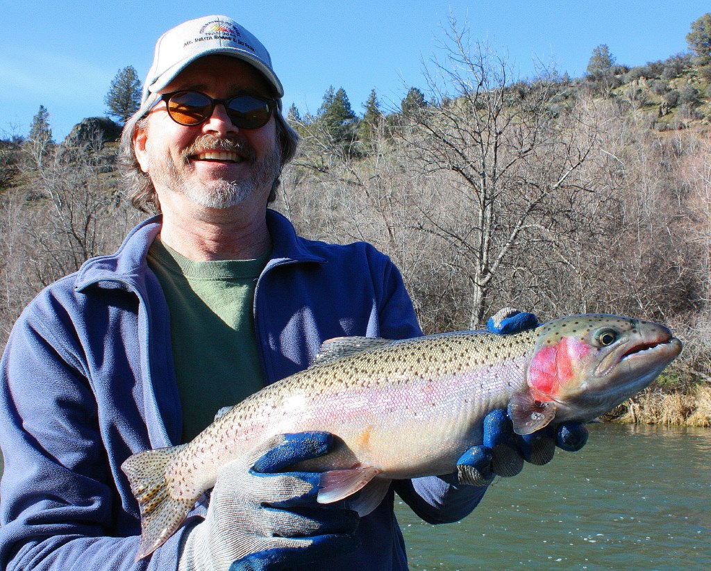 It was a beautiful if somewhat unseasonable day. Too warm for January, that’s for sure. Regardless, I nailed a couple of really nice ones. Scott had me working one bank where there was a little eddy and I kept missing the spot with my casts, just coming up short of where I wanted to be. I finally launched a good one that arced around the spot and just downstream of it and all of a sudden I got that great WHAM! that steelies are famous for. Even I couldn’t miss that. When the fish jumped out of the water right after I hooked him I almost fell out of the boat I was so excited. He kept squirming around after we landed him while Scott was trying to take a picture but somehow we managed. Later, further downstream, I got number two who was hiding behind a big rock. He fought hard and Scott had to move the boat to get a good angle and finally he appeared in the riffle, flashing his colors while he struggled. He was a really hard one to get a handle on but we pulled it off. They sure are beautiful fish! You can only keep the hatchery-raised ones (the adipose fin is clipped so you know) and these were wild so we released them. I’ll have to catch some local lake trout if I want to make a meal!