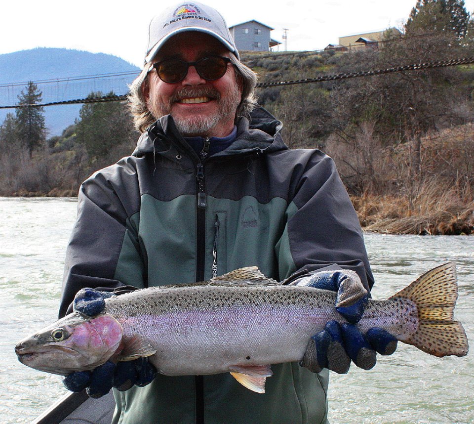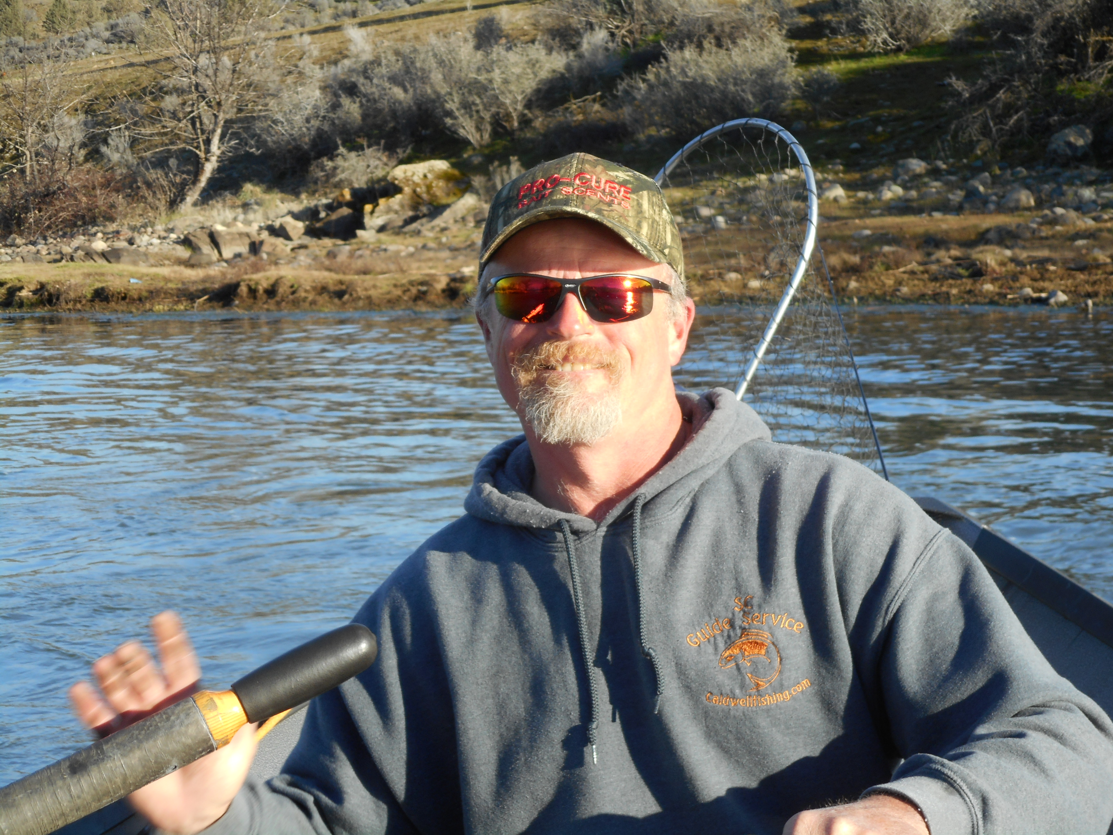 I’m the world’s worst fisherman. I catch my hook on logs or haul in weeds. The lures get stuck in bushes and the bait gets eaten without me knowing. My line always seems to get tangled and the reel makes funny noises half the time I’m working it. If I had to fish to eat I’d starve. Good thing there’s SC Guide Service. My pal Scott Caldwell, owner/operator of said service, promised me a fishing trip as a retirement present. I finally took him up on it and we fished the Upper Klamath yesterday for steelhead. Scott is one of those hook, line, and sinker wizards. He gets the fish to bite and then talks the damn thing into the boat. Here’s the inimitable Mr. C at the helm of his drift boat: