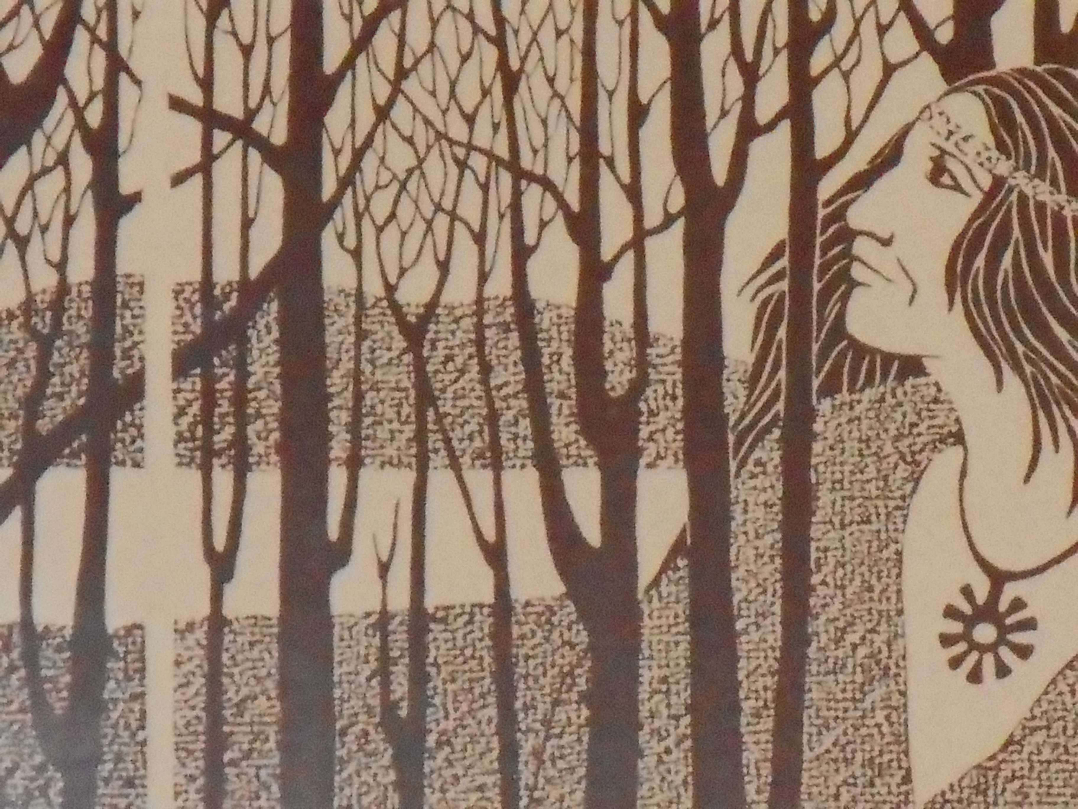 The Athabasca River originates in the glacier country of what is now Jasper National Park. It flows northeast for several hundred miles and empties into Lake Athabasca in Saskatchewan. That lake is drained by the Slave River into the Great Slave Lake and those waters ultimately find their way to the Arctic Ocean via the Mackenzie River. Athabasca is from the Cree language and supposedly describes the mixed willows and grasses of the delta country at the confluence with the Peace River. My late mother-in-law, the artist E.B. Rothwell, was inspired by this region’s native inhabitants and created a triptych of etchings called Athabasca I, II, and III which are similar in style to her Spiritus Loci series. That means “spirit of the place” and you can see something of that from the detail below (Athabasca III):