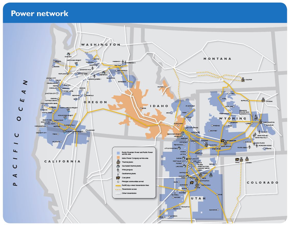I’m astonished and amazed by this. Abundant energy at a very low cost is available to me all the time wherever I go. I need not think about it. But I do think about it, it’s my curse. I think about everything. Here’s what I think: we should all know where our good life comes from. We should know what it takes to live the way we do. And what it takes is an elaborate system of resource extraction, power generation, and electricity distribution. Here’s a map from PacifiCorp, the parent company of our local utility: