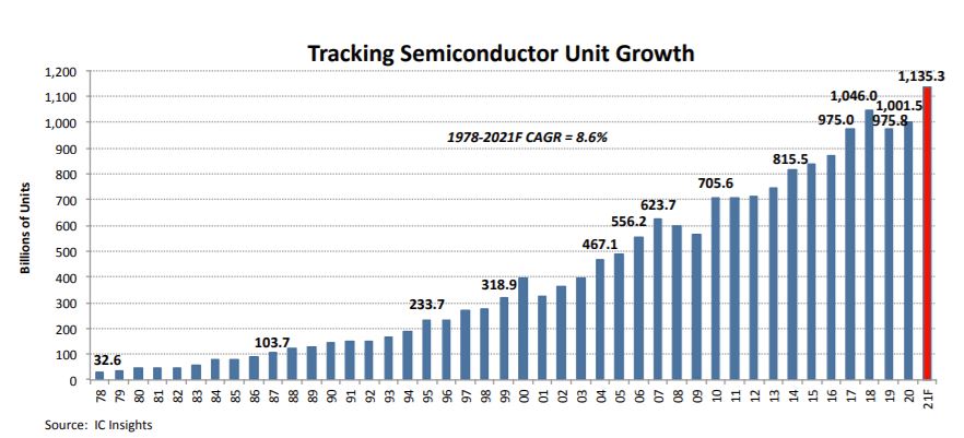 According to IC Insights, the number of semiconductor devices that will be shipped to users in 2021 exceeds one trillion. This milestone was also achieved in 2018 and 2019, and even in the midst of the pandemic, 975 billion were shipped in 2020. Seems like one trillion is the new benchmark. Here’s a graph: